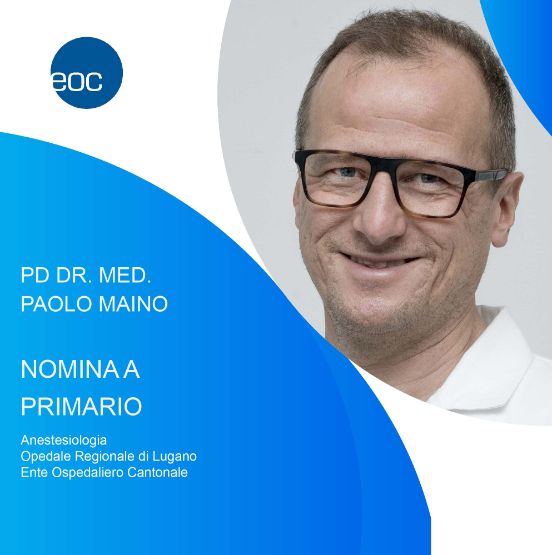 Bellinzona, 8 ottobre 2024 – Nella sua seduta di settembre 2024 il Consiglio di Amministrazione dell’Ente Ospedaliero Cantonale (EOC) ha nominato il PD Dr. med. Paolo Maino, specialista in Anestesia e Rianimazione con formazione approfondita in Terapia del dolore, alla funzione di primario di Anestesiologia dell’Ospedale Regionale di Lugano (ORL), con entrata in servizio il 01.10.2024.