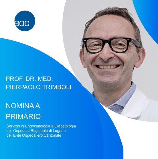 Bellinzona, 8 ottobre 2024 – Nella sua seduta di settembre 2024 il Consiglio di Amministrazione dell’Ente Ospedaliero Cantonale (EOC) ha nominato il Prof. Dr. med. Pierpaolo Trimboli alla funzione di primario del Servizio di Endocrinologia e Diabetologia dell’Ospedale Regionale di Lugano (ORL), con entrata in servizio il 01.10.2024.