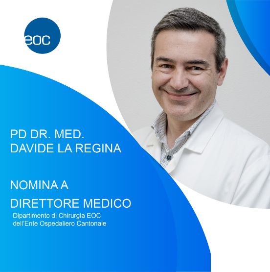 In data 10.10.2023 la Direzione generale ha approvato la nomina del PD Dr. med. Davide La Regina alla funzione di Direttore medico del Dipartimento di Chirurgia EOC, in sostituzione del Prof. Dr. med. Pietro Majno-Hurst (che rimane Primario di Chirurgia dell'Ospedale Regionale di Lugano) a partire dal 01.01.2024. EOC si congratula per la nomina e ringrazia il Prof. Dr. med. Pietro Majno-Hurst per il grande impegno profuso negli anni, alla guida del Dipartimento di Chirurgia EOC.