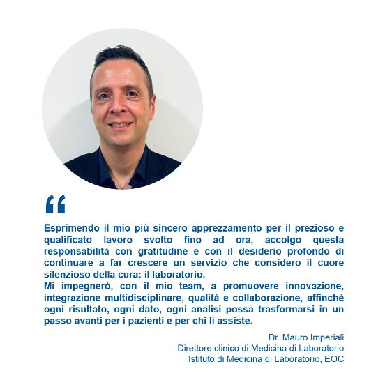 Nel mese di giugno 2025 il Consiglio di Amministrazione dell’Ente Ospedaliero Cantonale (EOC) ha nominato il Dr. Mauro Imperiali, PhD, biologo specializzato in medicina di laboratorio, Direttore clinico di Medicina di Laboratorio presso l'Istituto di Medicina di Laboratorio dell'Ente Ospedaliero Cantonale (EOLAB) dell'Ente Ospedaliero Cantonale (EOC).