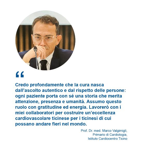Il Prof. Dr. med. Marco Valgimigli, attualmente viceprimario di Cardiologia e responsabile del Servizio di Ricerca Cardiovascolare in seno all'ICCT, a partire dal 01.01.2026 subentrerà al Prof. Dr. med. Giovanni Pedrazzini, che cesserà l'incarico per raggiunti limiti d'età.