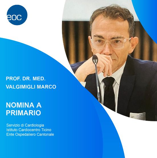 Il Consiglio di Amministrazione dell’Ente Ospedaliero Cantonale (EOC) ha nominato il Prof. Dr. med. Marco Valgimigli alla posizione di primario della Clinica di Cardiologia dell'Istituto Cardiocentro Ticino (ICCT) dell'Ente Ospedaliero Cantonale (EOC) e, contestualmente, il Consiglio dell’Università della Svizzera italiana (USI) ha confermato la sua nomina a Professore di ruolo di Cardiologia nella Facoltà di scienze biomediche.