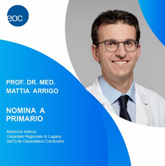 Nel mese di gennaio 2025 il Consiglio di Amministrazione dell’Ente Ospedaliero Cantonale (EOC) ha nominato il Prof. Dr. med. Mattia Arrigo, medico specialista in Medicina Interna e Cardiologia, primario del Servizio di Medicina Interna dell’Ospedale Regionale di Lugano (ORL). Nel mese di febbraio 2025 il Consiglio dell’Università della Svizzera italiana (USI) ha confermato la sua nomina a Professore ordinario di Medicina Interna nella Facoltà di scienze biomediche.